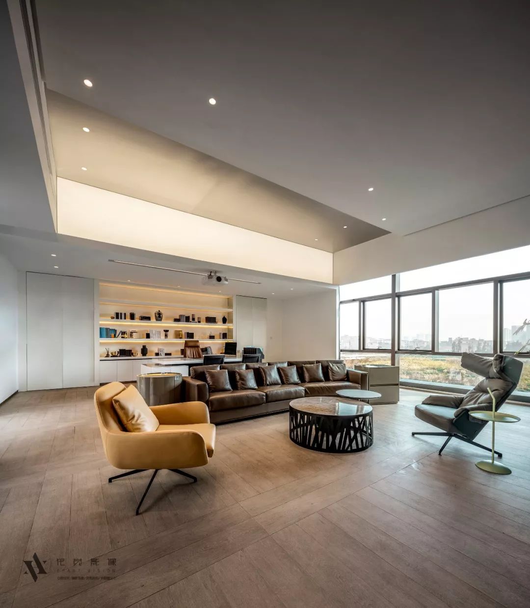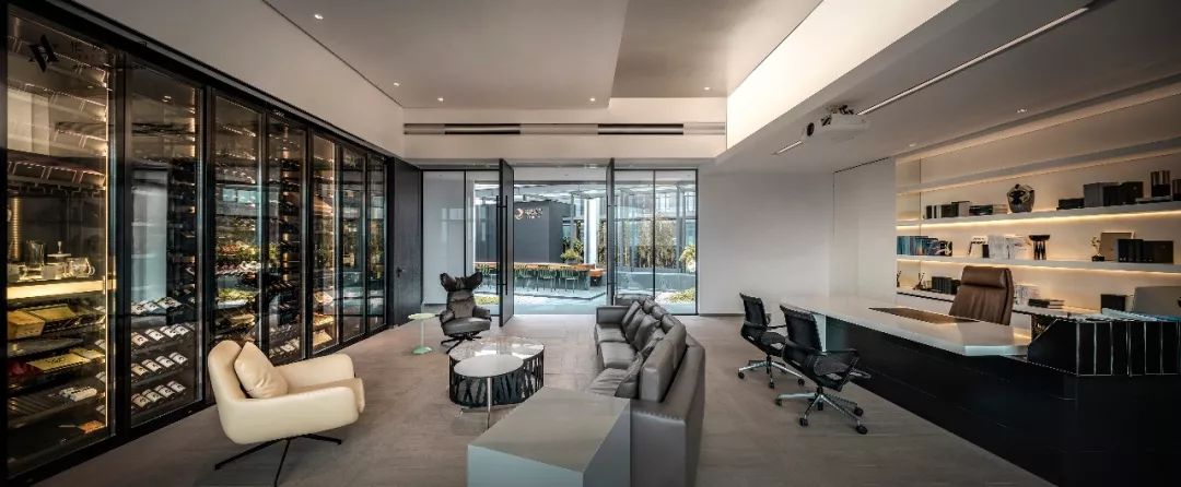 高级行政办公区的景观与班台组合相得益彰,透过窗外的美景,更显娴雅之气。严谨、庄重的独立办公室,融入会所的独有气质。佐以柔软的沙发混搭组合,运用金属、真皮、木材和酒柜在VIP接待空间的巧妙碰撞,彰显创始人独有的年轻活力与品位生活。